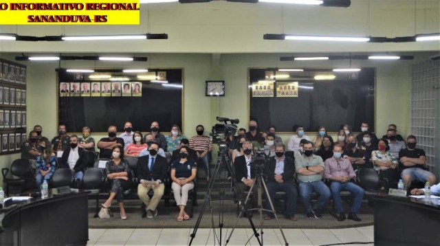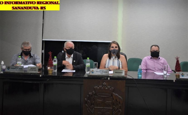 O Poder Legislativo de Sananduva sob a presidência da Vereadora Caroline Brezolin esteve reunido na noite desta quinta-feira 19.11 para a realização da sessão ordinária e na sequencia a sessão solene, em uma noite especial a fim de homenagear aos cidadãos e entidades que, de uma forma ou outra, contribuíram imensamente ao desenvolvimento de Sananduva, seja no campo econômico, cultural ou social. Com a presença dos vereadores Antuir Ricardo Pansera, Caroline Brezolin, Claudecir Domingos Zanin, Claudenir Polli, Eliani Mezadri, José Airton Gamarra de Souza, Odair Cirino Rodrigues,Valdomiro Fortuna,Vanderlei Perondi, Prefeito Municipal Leomar José Foscarini, Vice Prefeito Loevir Fidêncio Benedetti, homenageados, familiares e imprensa.